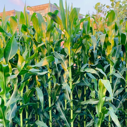 A reggeli napfény lágyan megvilágítja az erkélyt vagy a kertet, a harmatcseppek pedig megcsillannak a fényes kukoricaszemeken.